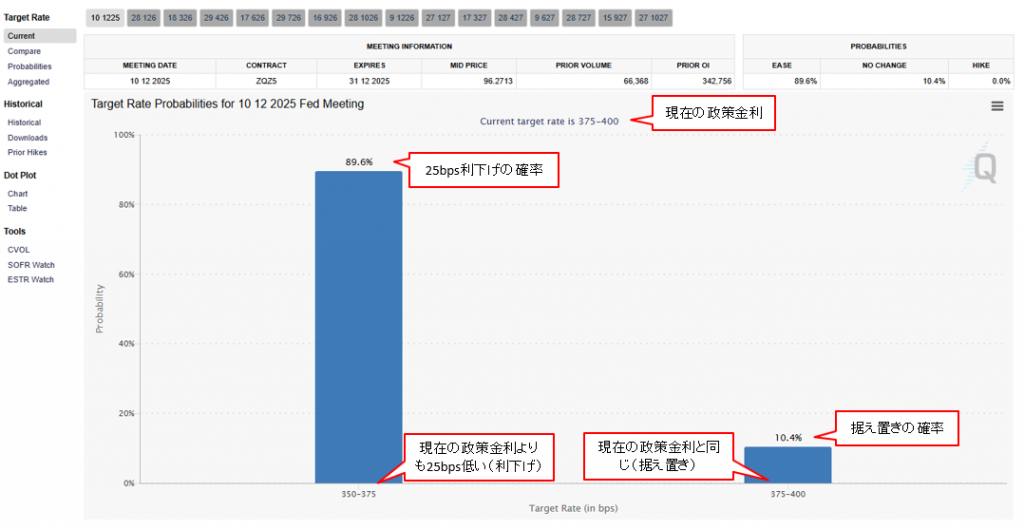 経済指標の発表や要人発言など、米国の政策金利に影響しそうなイベントがあった際、以下のように市場の利下げ・利上げ予想がニュースで流れることがあります。