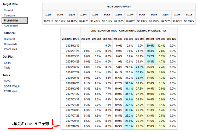 左のメニューでTargetRateの下の「Probabilities」をクリックすると2年くらい先までの金利予想も見ることができます。