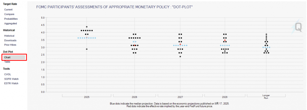 あとは、左メニューのDotPlotの下にある「Chart」をクリックすれば、直近のSEPで発表されたドットチャートを確認することもできます。
